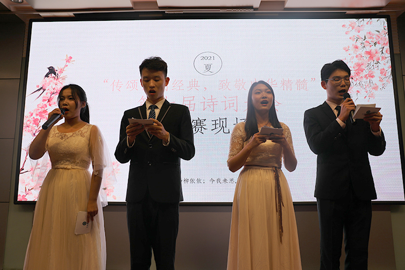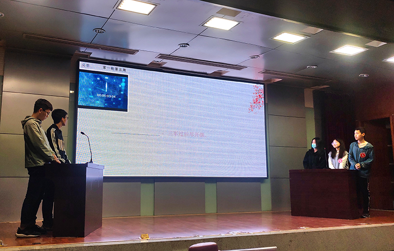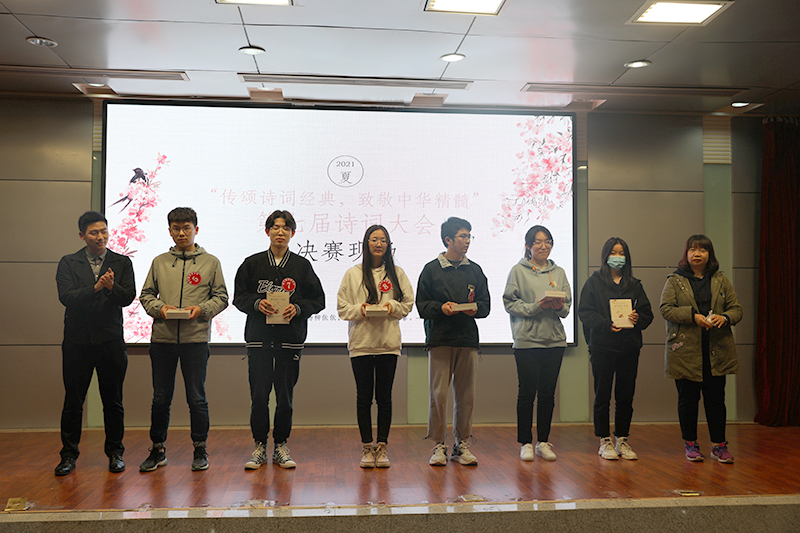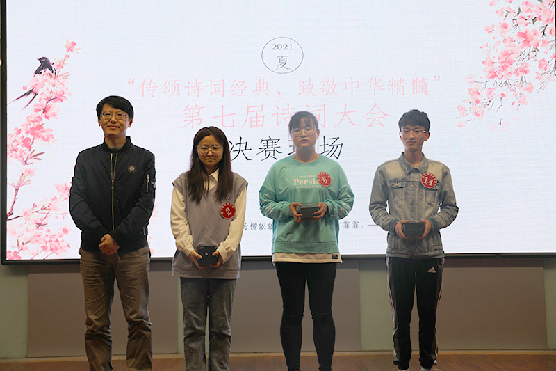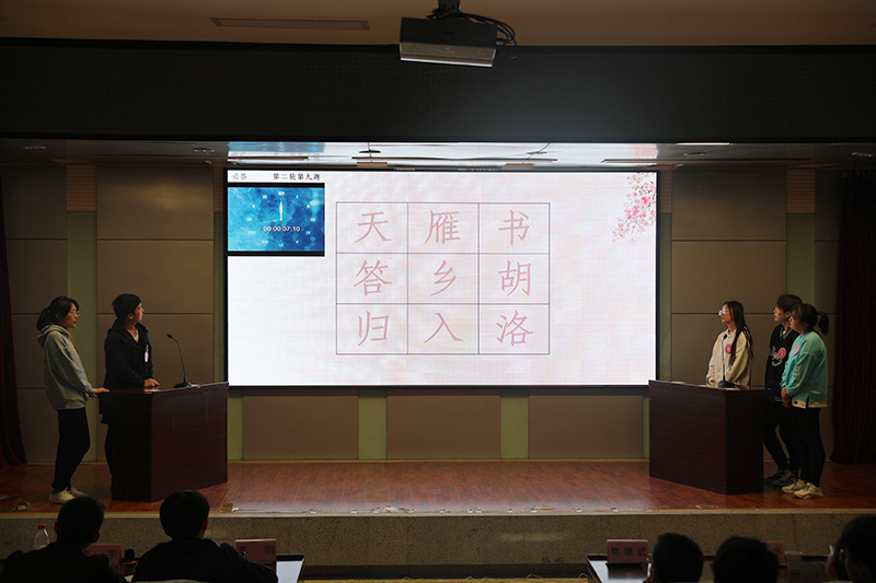 “酒千杯,诗万篇。”中国自古便是诗的国度。本届诗词大会总决赛由必答题、分组抢答题、等级挑战赛、桂冠赛等四个环节组成,较以往更加丰富、精彩。15位选手诗采飞扬,必答题有填充诗句、九宫格、十二宫格三种形式;分组抢答赛为描述性问题,抢答诗句,抢答现场紧张而又激烈;等级挑战赛分为3个难度,机遇与挑战考验着选手们的心理;桂冠赛中两场飞花令精彩绝伦,四名选手依次进行了描述“传统节日”和“爱国”的飞花赛。经过激烈角逐,最后来自通信学院的段阳阳一举摘得桂冠,获得一等奖,董昊南、张哲哲、杨虹景等3名选手获得二等奖,蒋国勋、杨瑞、刘永康、成思敏、梁雨轩等5名选手获得三等奖。