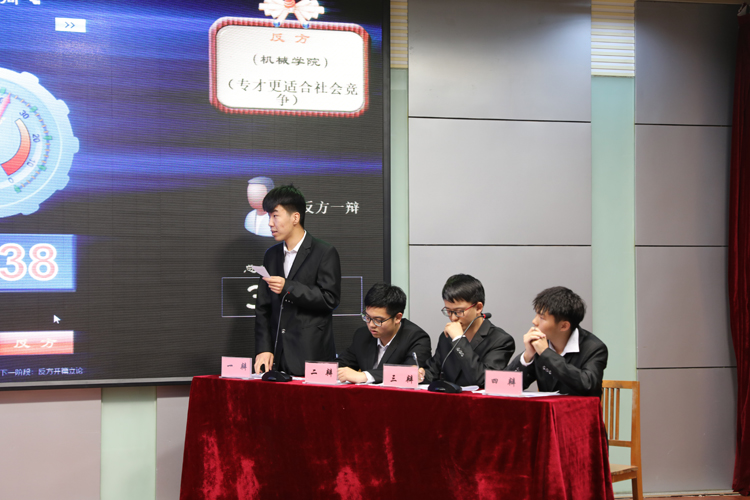 在季军赛中,围绕“全才更适合社会竞争还是专才更适合社会竞争”的辩题,正方人外学院从全才的整合性、竞争性、发展性三个角度出发,重点阐述了全才对社会发展的价值。反方机械学院则从社会分工的专业化发展背景和“干一行精一行”的传统观念两个方面,强调了社会对精细化人才的需求。
